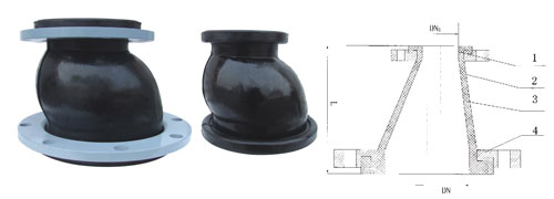 可曲挠偏心异径橡胶接头是在KXT橡胶接头的基础上改良的,可解决金属管道连接时不同口径、管道不同心的问题。偏心异径橡胶接头可解决金属管道连接时不同口径的问题,同时有减震降噪的作用,可节约管道安装零件,节约成本。它由内胶层、织物增强层、中胶层、外胶层、端部加固金属环或钢丝圈、并和金属法兰组成。具有耐压高、弹性好、位移量大、平衡管道偏差、降低噪音效果好、安装方便等特点。